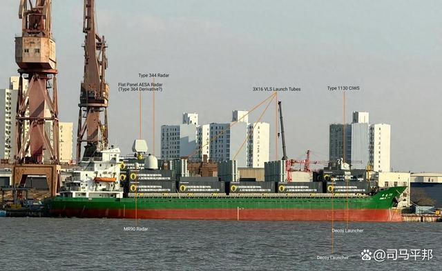 与此同时,就在扣押中国油轮后,美媒披露一艘中国货轮的照片,显示甲板配置了60单元导弹垂发系统及近防武器。尽管该船可能仅为测试模型,但其象征意义不容忽视,因为这可能暗示通过“军民融合”模式,将庞大商船队转化为战时辅助火力平台。